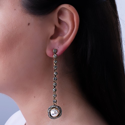 - İncili ve antrasit kristal cam taşlı pirinç küpedir.