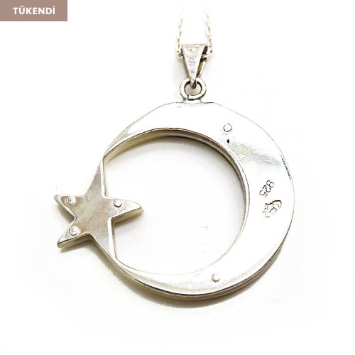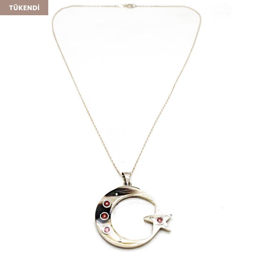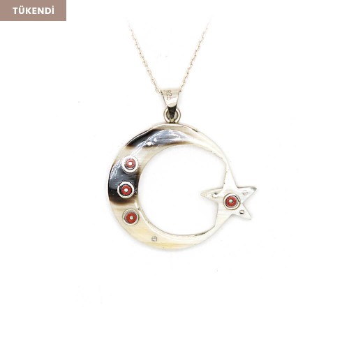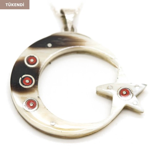 - Türk Bayrağı boynuz tasarım kolyenin üzerine kırmızı mercan, ve gümüş kakma sanatı uygulanmıştır.