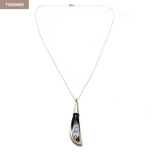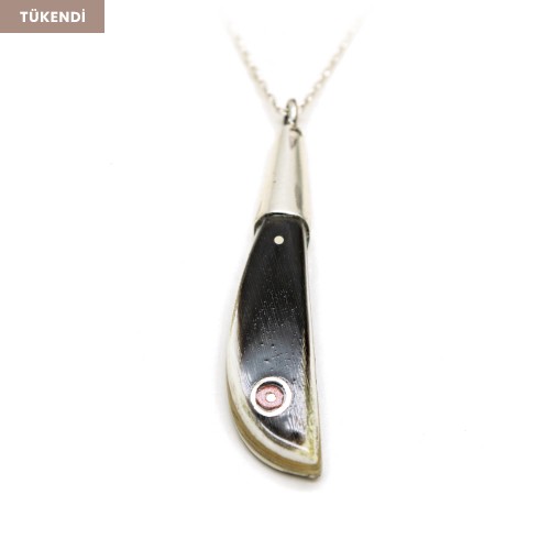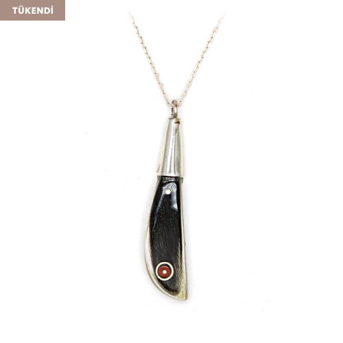 - Yavru balık desen boynuz tasarım kolyenin üzerine kırmızı mercan ve gümüş kakma sanatı uygulanmıştır.