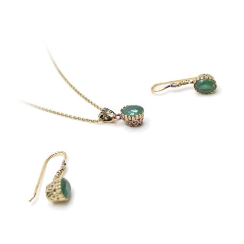 - Yeşil taşlı, oymalı desen pirinç kolye ve küpe settir.