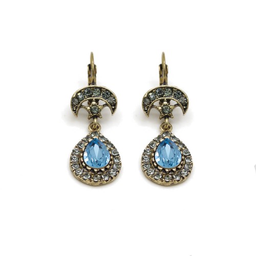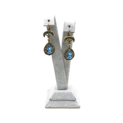 - Mavi ve duman renkli kristal cam taşlı pirinç küpedir.