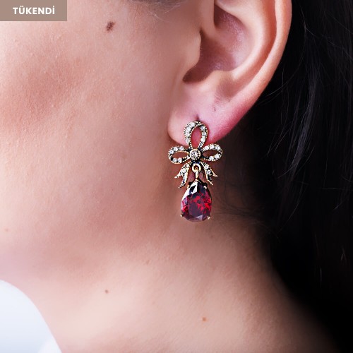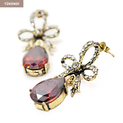 - Bordo renk kristal cam taşlı pirinç küpedir.