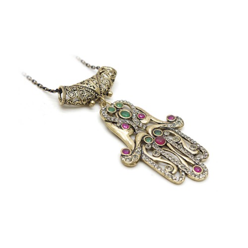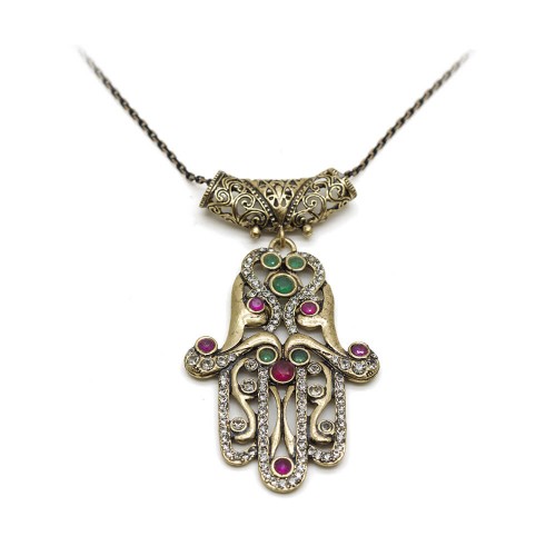 - Fatmanın eli desenli, kırmızı, yeşil ve duman renkli kristal cam taşlı pirinç kolyedir.