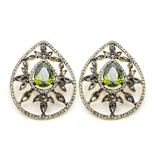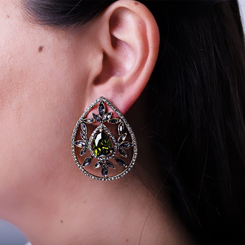 - Haki ve antrasit renkli kristal cam taşlı pirinç küpedir.