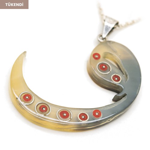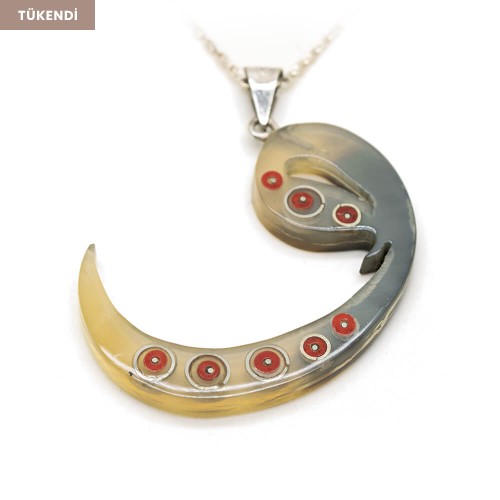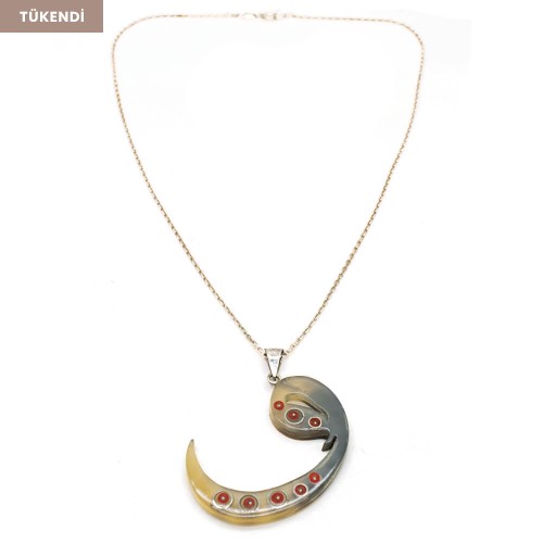 - Vav desen boynuz tasarım kolyenin üzerine kırmızı mercan ve gümüş kakma sanatı uygulanmıştır.
