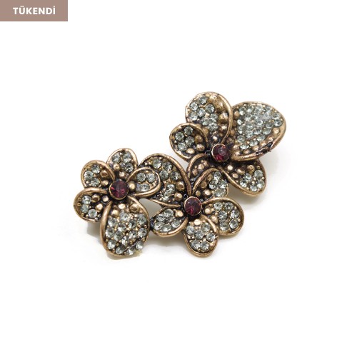 Ortası Mürdüm Taşlı Üç Çiçek Desen Pirinç Broş