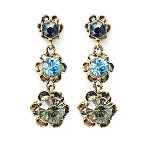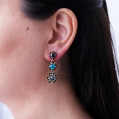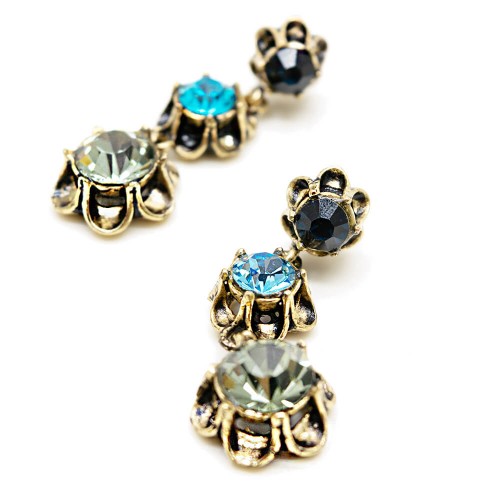 - Montana, mavi ve antrasit renkli kristal cam taşlı pirinç küpedir.