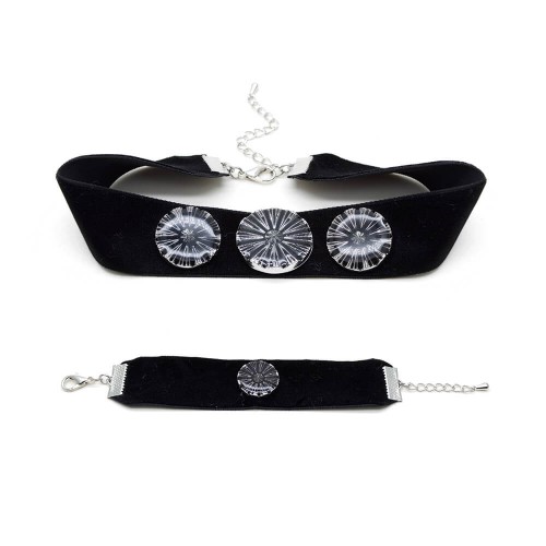 Siyah Kalın Kadife Üzeri Üçlü Parlak Tasarım Choker Tasma Set
