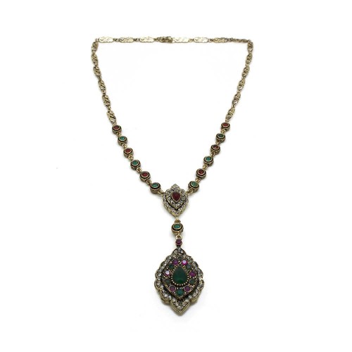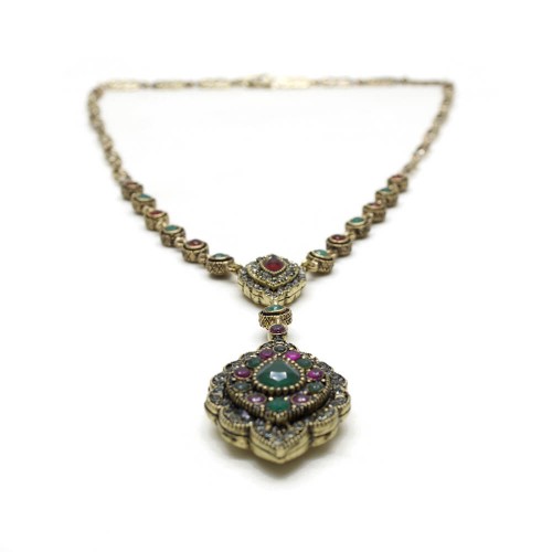 - Kırmızı, yeşil ve duman renkli kristal cam taşlı pirinç gerdanlıktır.
